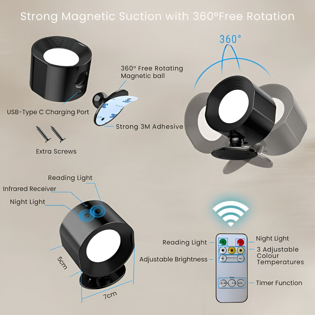 - The LED Wall Lamp connects to the wall mount with a 360° rotating magnetic ball that allows you to rotate the direction of the light source according to your needs